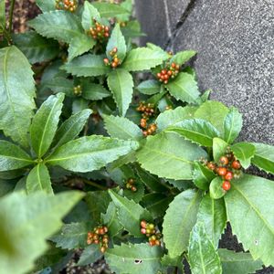 今晩は🌟 今日の植物さん達❁¨̮ 色付いてきたセンリョウの実♪ 冬に映える鮮やかな実ですね🔴◝(⑅•ᴗ•⑅)◜ カナリアスマイルさん🌼 誰が食べたの〜?( ˊ•̥ ̯ •̥`) ナメクジ?バッタ🦗?