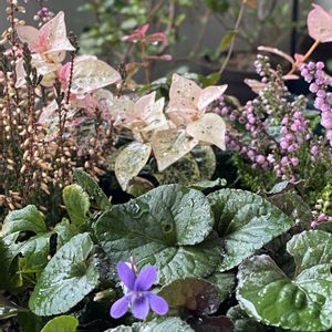 雨が降ったり止んだりの日曜日 朝イチに園芸店へ パンジー&ビオラお迎え予定でしたが 迷って決められず・・ 夏越しした黒葉スミレ 白いガーデンシクラメンと寄せ植え用に ハツユキカズラ 初雪っ子 カルーナガーデンガールズ カルーナブルガリスG紅 お迎えしました 久しぶりに寄せ植えをしました 楽しいですね🤭 寄せ植え終えたら 太陽が😊☀️