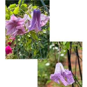 晴空 22℃予報☀️ 夜中に雨が降った様でお花と葉っぱさんが嬉しそうな朝💕 「わーい♪」 楽しみにしていた篭口さんが咲いていました💕🥰🙌 大きいpic、その右縦長、そこから斜め下2枚にニッコリ顔で登場🎶 艶々の紫色の小さなお花💕 ヤマボウシ木の下なので、見上げると葉っぱと青空も素敵です💕 そして右下2枚のpic 早咲き大輪種の春日井さん 下のお花は6/29に咲いた時の物。 少し前に蕾が出てきて嬉しく思っていましたが、ラティスの補強時に移動したのがダメだった様でここまで育ったのに枯らせてしまいました。 開花するまで待ってあげれば良かった。 ごめんね。 二本出ていた茎が両方ともしんなりして葉の色も変わって復活は無さそう。🥲 そしてもう一つ。 写していませんが、今年2年目のアーネストマークハム。 去年より少し茎が伸びましたが、これもすぐに蕾も出ずに今年も枯れてしまいました。🥲 新旧両枝咲きの苗なのですが、今年も旧枝が冬越し出来そうな太さでは無いので無くなりそう。 2株とも根が元気なまま残っています様に🍀 真ん中下は 昨日も登場したキンロウバイさんとクレマチス。 右がアラベラ、左がマルモリ。 そしてその左斜めがマルモリさんの姿💕 まだ蕾が沢山あるから9月も可愛い姿を楽しめそうです🎶😘 今日も優しい気持ちで過ごせますように✨🥰🍀