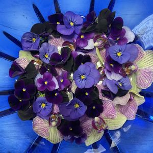 おはようございます💎🩵💙💜🩵💙 長く咲いて楽しませてもらいました ビオラ と ミニ胡蝶蘭 カット✂️して 花遊び ブルーのガラスの器に 浮かべました