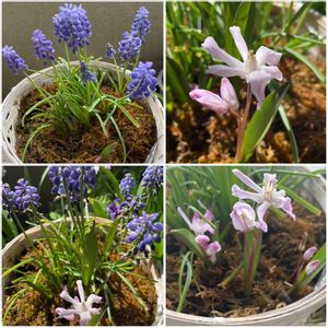 わが家のプチベランダ 寄せ植えの ムスカリ と チオノドクサ ピンクジャイアント 右下 今日の姿