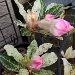 斑入りアデニウムさんが ピンク色の可愛い蕾ちゃんを 付けてました😻💗 嬉しさもつかの間 明日の台風に備え 室内に取り込みます😿