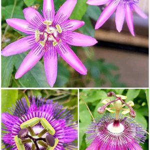 🍀今日のお花、トケイソウ 我が家のトケイソウ達です⏰ 💜アメジスト、ちょうど今朝9時半🕤撮影📱😅クサトケイソウです 行灯仕立て、3輪開花💜💜💜 💗💮クサトケイソウ、パッションフラワー(名前が長すぎるので🏷で🙇) クサトケイソウですが、イガイガの中に緑からピンクの蕾ができ、💮開花→またイガの中に戻り結実🟢→🔴赤くなります。 夏に向けてこれから蕾を持ちます(昨年Picより) ↘パッションフルーツ(=クダモノトケイソウ) 1番花が結実していました😋💓