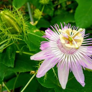 おはようございます☀ パッションフラワー2輪目📱✨開花です。 これは⏰早起きさんで、朝7時前には もう雌しべを開いて下に下げています。 1輪目は早起き、先を越され👀既に萎みかけでした😅💦 イガイガの中に💚→🩷ピンクの蕾をつけ、朝も早々に萎んで…、またイガイガの中へ格納🤭(…?) イガイガの中で結実した実が 緑🟢から赤🔴に変わります。 草トケイソウなのですが、実は特に有毒ではないそうで😋、葉っぱ🌿も触れるとパッション系の匂いがプンプンします🐽💕