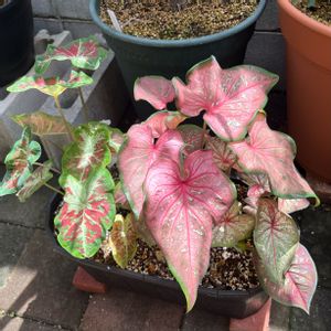 ■Caladium 'Pink Symphony' ・カラジウム ピンクシンフォニー 下の方の小さな葉は、模様が入らず緑の葉になるのはどういうからくりなんでしょうか。 2枚目左上はコロカシア モヒート、右下はカラジウム カリビアンコーラルです。