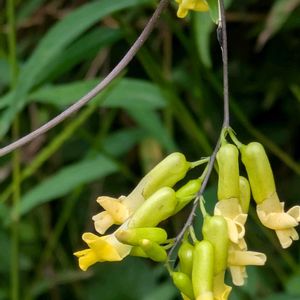 ノササゲ マメ科特有の蝶形花が、黄色の房状にぶら下がる 月曜にビタミンカラー🏷🟡 淡い黄緑色の円筒形をしたガクのギザギザはなく直線的で、トキリマメやタンキリマメにあるような黄色い腺点なし(3枚目) 葉は3小葉の複葉でZ巻きでよじ登る つる巻き月曜日🏷🌀 裏面は白っぽくて、こちらにも腺点なしですね🟢(4、5枚目)