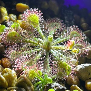 🟨モウセンゴケ属 トウカイコモウセンゴケ🟩 東海の名がつく通り、日本の湿地に自生する食虫植物のトウカイコモウセンゴケです。 葉についた毛の先端から出している丸い水滴のような粘液で虫を捕まえています。 触るとネバネバしていて、虫は一度この葉に止まったら、2度と青空を飛ぶことはないでしょう。 すこし用土が粗すぎるような気もしますが、元気に育っています。購入してこの鉢に植え替える時、草が小さいだけあって根っこもほとんどなく、一度植え替えのストレスからかかなり弱ってしまいました。しかし、水を切らさないように腰水にして、肥料や活力剤も時々やるようにしていたら、小さかった1株は枯れてしまいましたが、他の2株はこのように復活しましたね☺️