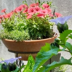 おはようございます。 今日もお天気晴れ☀️ 玄関前の鉢植え ①真っ赤なペチュニア ②クロホウズキ ③④植木鉢の人形と (もう20年位前の物) ダールベルグデージーの花 今日も1日明るくね!