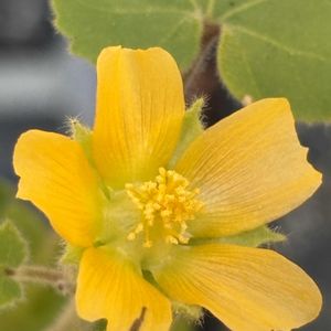 野に咲く花 (午前10時) 夏🔥から秋🍂にかけて 径2cmほどの橙黄色の花💛🧡 葉は揉むと特有の異臭が あるらしい😹? (不思議な形の果実を先に見つけ 次の日に花発見 多分まだ開花途中) イチビの花 アオイ科
