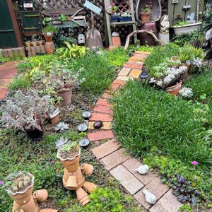 『不思議の国のアリス』をイメージした…今年のアリスガーデンはこんな仕上がりに♫ ①カラーサンド&多肉のアフタヌーンティー風寄植えに… →②隣にはアリスカラーのロベリアとウサギ🐰 →③色褪せてきた自作トランプ型ステップストーンもお色直し🃏 →④狂った時計はライト部分を紛失してしまい💦代わりに仕込んだアイビー →⑤今年も夜は紅茶のライトが注がれます☕