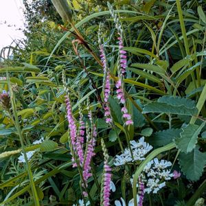 今日のお花水引です ①赤白ミズヒキ②ミズヒキと花遊び③ヒキオコシ④黒花ヒキオコシ⑤満開のトリカブト
