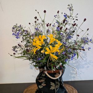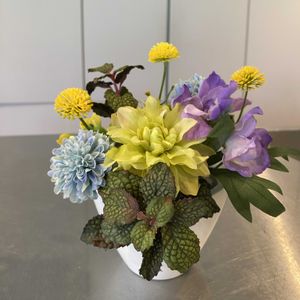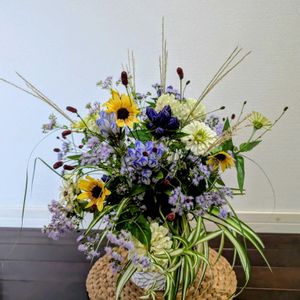 こんにちは😃 今月の花あそび花まなび講座、 造花のお盆アレンジ。 造花のアレンジは初挑戦でしたが、楽しく出来上がりました。 最初のは父に、2枚目は愛犬リロに🥰