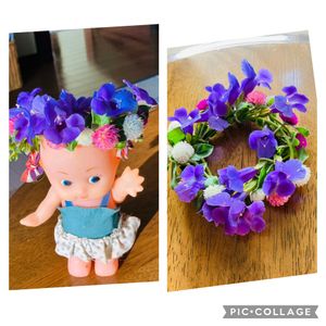 お花で遊びました🌼 庭のトレニアと千日紅の切り戻したお花で花冠を作ってみました🌸🎵 キューピーちゃんにモデルになってもらいました😊 昨日イチヂク園に行って大好きないちじくを買いに^_^甘くておいしー いつもみてくださりありがとうございます😊