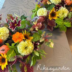 ①昨日は花遊び教室をしました、ハロウィン🎃バージョン👻 ②ジニアを入れてジュランタ宝塚がアクセントに。 ③主にダークな色でまとめてシックな感じに。 ④マリーゴールドやジニアを入れて賑やかな感じに。 ⑤今日は最高気温が20度🍂庭から花を選んで準備する時間が楽しい1日でした。