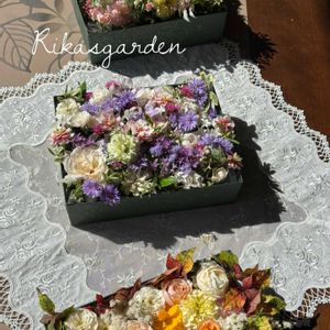 ①今日の花遊び教室は、ボックスフラワーを作って楽しみました。 ②③④根気のいる作業でしたが、うちの庭のお花をステキに飾ってもらえて嬉しい〜☺️ ⑤どのアレンジも好き🥰