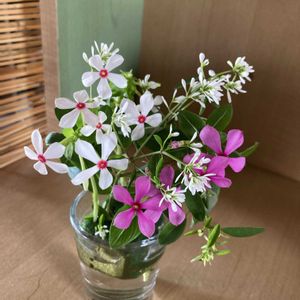 おはようございます😃 庭に咲く花を小さなグラスに挿してみました。 フェアリースターの白🤍 とピンク🩷 ダイアモンドフロスト❄️ 休みの朝は花摘みからゆったり 過ごすのも良き
