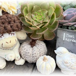 コンバンワꔛ(*ˊᵕˋ*)ノ" 日が落ちるのが早くなり 悲しいけれど( ᵕ ᵕ̩̩ ) 多肉達がわいくなって うれしくもありますね\(嬉ˊᗜˋ*)/♥ アエオニウム❤︎ハロウィン🪴 レガモンちゃんと🐵ྀི いただいた手編みのかぼちゃ🎃& モルタルのかぼちゃと小鳥さん🕊️.° - ̗̀ 🏷ソクモン祭り⁺◦🧦 ̖́- 参加しまꔛす(*´︶`*)ฅ💕