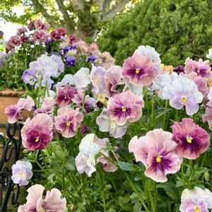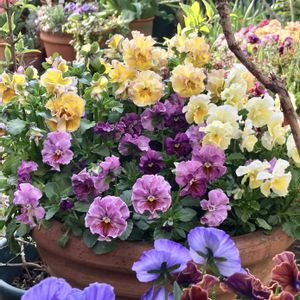 午後の庭から… 13:38〜15:55今日 ヒメコブシの若葉が優しい陰に..♡ ① パンジーフェデネージュ ② ビオラの寄せ植え ③ パンジーとビオラの寄せ植え *ミルフルアンティークフリル💛 *パンジー和モダンクラシック🤎 *パンジーマシェリマダム(後ろ) ④ パピヨンワールドとメゾンドビオラ ⑤ ヒメコブシの下の寄せ植え
