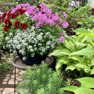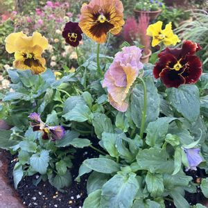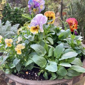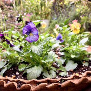 今日の庭から 10:26〜10:51 昨夕植え始め日没サスペンデッド⁈ 今朝完成のパンビオ寄せ植え ❶❷❸ ・フリル咲きパンジーヴォーグ 5株 ・メゾンドビオラ リュクスアンティーク2株 ❹ 道の駅で購入したビオラシャルロット 徒長気味だったがウチでますます伸びて ❺ シアワセな気分になるクリサンセマム シャルメ