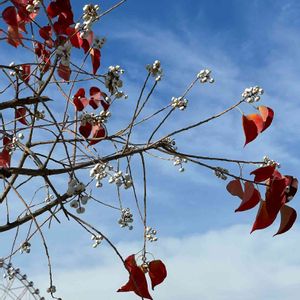 紅葉と白い実、ナンキンバゼが青空に映えて綺麗でした✨🍁 左下には、葛西臨海公園の大観覧車が、写っています🎡