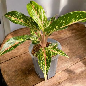 葉模様が美しく、主脈はうすピンク色をしているアグラオネマ•ピンクバタフライ🩷💚 茎もうすピンク色💕😍 スマホでは実際の色味が出ないのが残念です😢
