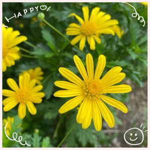 おはようございます😃 今日も皆さまにhappy〜💕 ユリオプスデージーのお花がたくさん咲いてキレイです😍🌼 ④〜🏷️土曜はお空の発表会に参加しまーす♬ 畑にはマリーゴールド、コスモス満開です💛🧡💕 職場にて〜