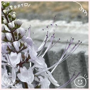 おはようございます😃 今日も皆さまにhappy〜💕 初めてお迎えしたネコノヒゲ😺 白いお花だと思っていたら薄っすら紫色になるんですね〜感激❣️🤩 花芽も次々と出てきてます♬