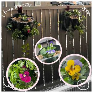 おはようございます😃 今日も皆さまにhappy〜💕 初挑戦❣️スリットバスケットに寄せ植えしてみました♬ パンビオ、アリッサム、ヘデラ😍 もう一つは残ったヘデラとパンビオ、昨年の伸び過ぎたヘリクリサム🤭💦 フワフワお花のブーケを妄想しております〜😆♬
