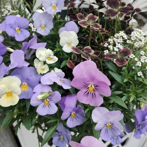 ハンギングバスケット🍀 種からのビオラとアリッサムを適当に植え込んだスリットバスケットです 梅雨入りぐらいまでは頑張ってもらおう😆