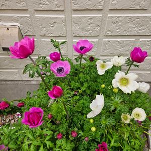 今朝の玄関先の花壇です。 ようやくアネモネ姉さんが花を咲かせてくれました👏 球根を植えてから約6ヶ月、長かったわー!😭 咲くの?咲かないの?どっちなのー?!と、やきもきし過ぎて引っこ抜きたくなる衝動を抑えるのが大変でした…せっかちな私には、普段は存在を忘れていられる植えっぱなし球根ぐらいがちょうど良いのかも? 植えた球根のパッケージから判断するに、右下のお花は菊咲きアネモネのようなんだけど、確かに菊っぽいかなぁ。