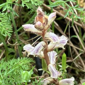 おはようございます☔️ 1️⃣ハマウツボ 植物園の冷温室で見ました。 葉緑素を欠いた完全な寄生植物。 花は、紫色で海岸や川原の砂地に生え カワラヨモギ属に寄生する。 ハマウツボ科ハマウツボ属の一年草。 在来種。 2️⃣ヤセウツボ 過去に昭和記念公園で見ました。 ハマウツボ科の寄生植物。 地中海沿岸原産 キク科、セリ科、マメ科などに寄生。 外来種 花期 4〜5月