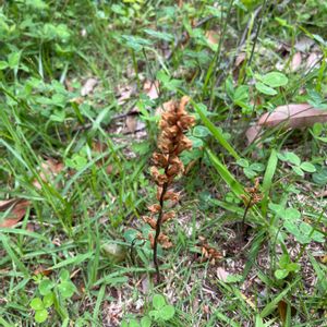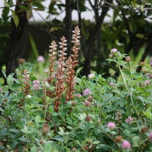 グランド側の草むらの中で「ヤセウツボ」が居ました。 マメ科の植物から養分を摂取する寄生植物で、シロツメクサに寄生したものは小さく、アカツメクサに寄生したものは大きな株になるとのこと。 もう枯れた状態の様です😄