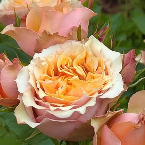 おはようございます😊 セレストがたくさん咲き出しました💕 写真だとオレンジや黄色みたいですが、実際は、外弁にグリーンがのった辛子色のバラなんです。