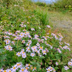 今日のお花💙ノコンギク(キク科・シオン属)🩵 大好きな花だけど、野菊って、いろいろあり見分けるの難しく〜 ①②③ 💙白馬八方・うさぎ平で〜(白い花はシロヨメナ?) ④⑤ 🩵和歌山・生石高原で見つけた野紺菊の群落 (どれも過去ピックです)