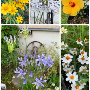 今朝の庭から➰💜🌿🌺🌿💛 我が家にもアガパンサスの季節が やって来ました🥰 昨秋 友人からもらった ハイビスカスの🪴挿木苗に お花が‥🌺🎶 💛🤍💛🤍 可愛いお花🌼も‥ 名前忘れました😅🤔💧