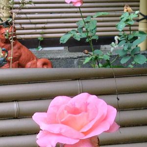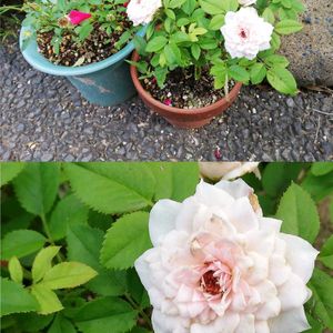 庭の一角 シリーズ ① 八重のミニバラ ② 他の 3時草は咲いてないけど これだけ 頼りなく咲いていた。 小さく作った小品盆栽 ③ 五葉松の盆栽 ④⑤ ソテツのオスとメス