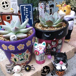 おはようございます🍀 肌寒い朝。 外気温13℃です💕 🏷️フクロウ祭 🏷️ハロウィン月間 🏷️ちょこんとピータン 🏷️るる かまぼこ板で繋がる輪 1枚目は、去年のsawaさんのリメ鉢と今年のえつこさんのリメ鉢の多肉たち。もうすぐハロウィン🎃 2枚目は、ハート♡の支柱2週目の亀甲竜さん。 まつぴよさんのフクロウさんもみんな集合です🦉 3枚目は、大切にとってあったハグ鉢。anemoneさんの多肉弁当IN。優しい色合いが、大好きです💕 4枚目は、りぁんさんの新作リメ鉢。ピーチ姫かぴったり💖 5枚目は、sumiさんのリメ鉢にストロベリーカラーのパープルヘイズをIN。黒か薄紫で悩みましたが、sumiさんの一言で黒にして正解🤗イメージぴったりでした💕 多肉事が楽しい季節になりましたが、まだまだ蚊には、要注意‼️ 今日も宜しくお願いします🌿
