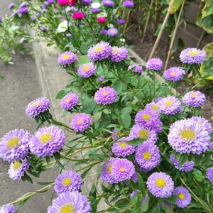 🌿💜❤️💗エゾギク(蝦夷菊)💗❤️💜🌿 別名 アスター キク科エゾギク属の半耐寒性一年草 川沿いの遊歩道と道路に挟まれた少しの土でも、こんなにたくさんのお花を咲かせています💗❤️💜🌿