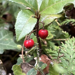 赤い果実いろいろ… ヤブコウジ(藪柑子)=十両:お庭より モチノキ(黐の木) シロダモ(白ダモ) ロウヤガキ(老爺柿) ナンテン(南天) ⚫︎⚪︎⚪︎⚪︎⚪︎