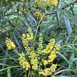 お散歩中に見たお花(樹木)たち… マホニアコンフューサ💛 アジサイ(紫陽花)🩷 ジュウガツザクラ(十月桜)🤍 細葉柊南天 ⚫︎⚪︎⚪︎