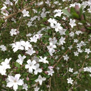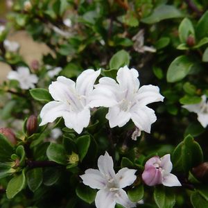 白丁花(ハクチョウゲ) アカネ科ハクチョウゲ属の常緑低木。中国原産。細かい葉が密生することから、垣根などに用いられる。挿木で育てることが比較的簡単で、盆栽にもされる。花期は5~7月。葉腋に漏斗状で先端が深く5裂した小さな花が沢山咲く。雌しべが雄しべよりも長いものと短いものがあり、別々の株に咲く。園芸品種には、淡紅色の花色、花が大きな二重咲きや八重咲き、日本で誕生した斑入り葉などがある。 丁子(チョウジ)に似た形の白い花が咲くことが名前の由来。鳥の白鳥とは無関係。6月頃に白い小さな花を沢山咲かせることから、中国名は『六月雪』と表す。 出典『樹木の事典 600種』『樹木の名前』