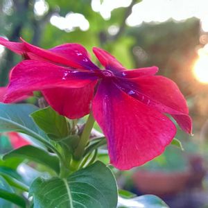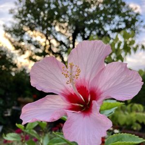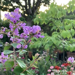 今夕の庭から…① 17:27 久しぶりに咲いたクリスタルピンクを 夕日の近くに.. 後ろの木はヒメコブシ 🏷️木曜日は木 ヒメコブシ
