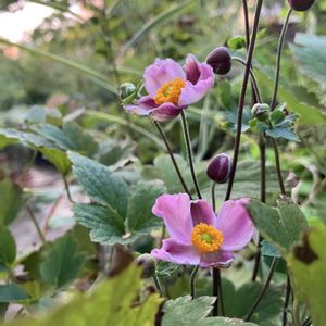 今夕の庭から… 18:00〜18:19 ❶シュウメイギク・ももいろブーケ咲く ❷❸ヒメコブシが まだ若いハナミズキを 酷暑から守っている 🏷️木曜日は木