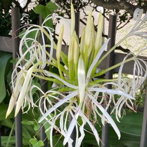 8月23日 今日のお花 🤍🤍🌿ハマユウ🌿🤍🤍 ハマユウ(浜木綿)の花と青い実です。 別名 ハマオモト(浜万年青) 開花期 6〜9月 草丈 50〜80cm 花径の先に細長い6弁の反り返る花をたくさん咲かせる。