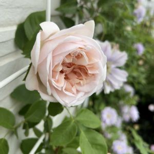 庭のバラ 1枚目・2枚目 シンベリン イングリッシュローズの廃盤品種 グレイッシュピンクの独特な色と濃いミルラ香 クレマチス るりおこしとの競演に間に合いました 3枚目 アリスターステラグレイ 作出者グレイが息子アリスターと出産時亡くなった 妻ステラの名を冠した切ない名前のバラ 午後からしか日があたらない場所ですが 壁面いっぱいに枝を伸ばしています 4枚目 リナルド 今年も渋い紫で咲きました 実物はもっと渋い色 帰宅後雨の中開花を発見し 「おぉ」「マジか」と呟きながらの撮影でした