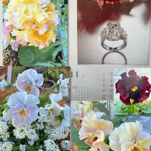 ↖️ローブドゥアントワネット ↙️シエルブリエ ↗️宝石屋さんカレンダー(宝石は買えないꉂ🤣𐤔) ➡️ローブドゥアントワネットソワレ ↘️ペルクレア🌸 今のところ4種のパンジー🌸GET💗 2枚目📸 マユハケオモト日陰のところで開花🌼 3枚目 仕事帰りの夕焼け🌇🌅