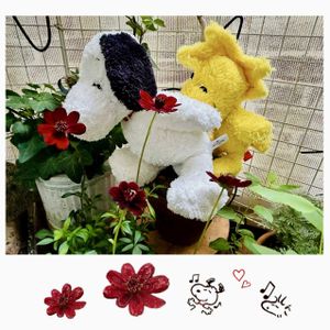 チョコレートコスモスで 🏷️毎月2日はスヌーピーの日 に参加しまーす♩ 1️⃣ (・’’(●)💬 アーフ・アーフ 通訳:チョコレートの香りがするよー ∧( 'Θ' )∧💬 🍫チチチチチ 2️⃣ 上段コスモスの切り抜きを1️⃣の下の方に貼り付けました🤗