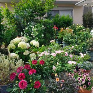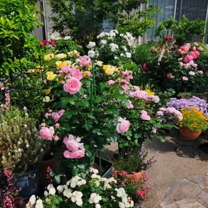 本日、神奈川県西部の我が家では30℃の夏日☀ 朝キレイに咲いていた薔薇たちだったのですが、仕事から戻るとチリチリシワシワに・・・😨 今日の薔薇は ①〜④ロサオリエンティスプログレッシオ 『楼蘭 』 小ぶりの花が房咲きになって、めちゃくちゃ可愛かったです💖ただのピンクではない、色もイイ✨✨ 去年横に広がりすぎて、狭い庭では引っかかって扱いにくかったので、冬にかなりコンパクトに、内芽で剪定しました でも、やっぱり横広がりに咲きました😅 とはいえ、広がった樹形も楼蘭の魅力の一つ 樹全体の雰囲気もステキだなぁと改めて思います🥰 広いお庭でおおらかに仕立ててあげられたらなぁ 花持ちの良い楼蘭。もう少し楽しめるはずだったのですが、この写真撮影後、暴風雨になったため、花が傷んで、春の一番花はあっけなく終了したのでした😢 ⑤プログレッシオ繋がりで、今年もたくさん咲いた 『シャルール 』 最後の房咲きもすごかった‼️ 咲き進むと色が変化するので、順に開いた花がグラデーションとなって、とても美しかったです✨✨