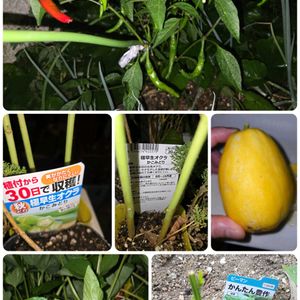トウガラシ収穫始めました(〃´ー`人´ー`〃) 折れたピーマン、いつの間にか葉っぱがいっぱいにd=(^o^)=b オクラはいつもハマキムシの襲撃に合うけど、収穫出来るかしら?(∩゚∀`∩) メロン(マクワウリ)1個GETd=(^o^)=b