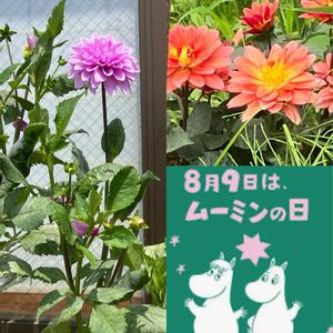 おはようございます😊 ①ダリア(散歩道にて☺️) 🏷️毎月9日は球根植物の日 参加します。 ②ムーミンとスナフキンとタイタンビカス(散歩道にて😊) 2人で「大きな花だね❣️」言ってますよ🤭 ③ワイルドオーツ 小判草に似ているので和名は、 偽小判草で、別名は、セイヨウコバンソウ、カラムギとも🤗 ④バーベナ・ハスタータ🩷💜 コラージュしました🤭 ⑤ルドベキア・ヘンリーアイラーズ 細い筒状の花弁がユニーク😄 ③④⑤神峰公園にて😁 🏷️ムーミンの日参加します。